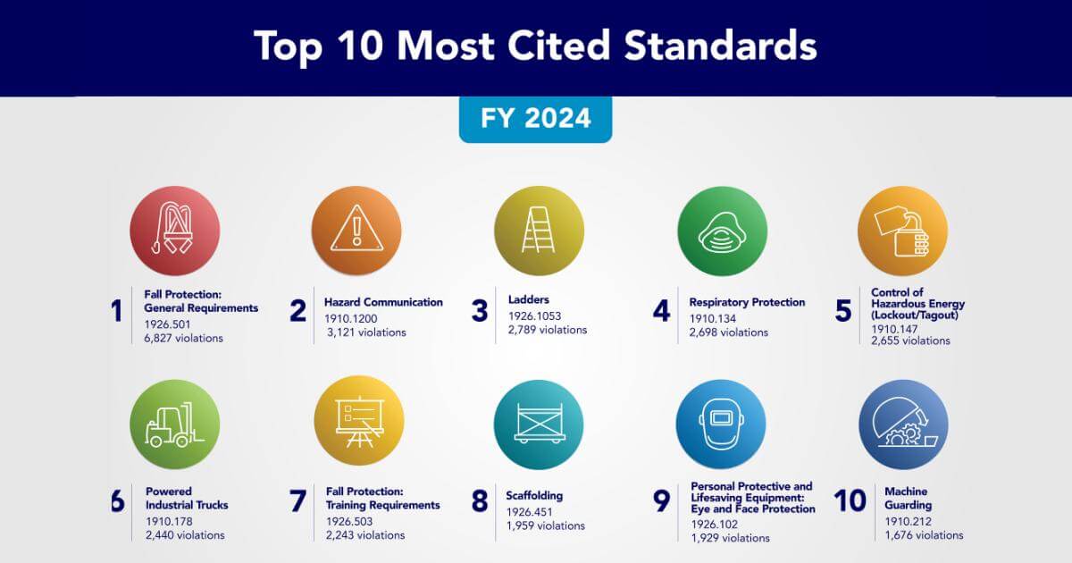 While the exact rankings can shift slightly from year to year, several hazards consistently appear near the top of OSHA’s list. These violations highlight common safety risks that, if not addressed, can lead to serious workplace injuries.